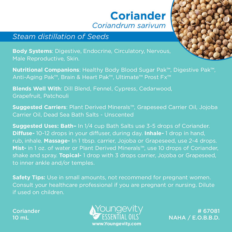 Coriander Essential Oil is a 100% pure therapeutic essential oil produced with the highest level of standard and safety. Steam-distilled or cold pressed with non-destructive techniques to extract and preserve the integrity of the essence.
