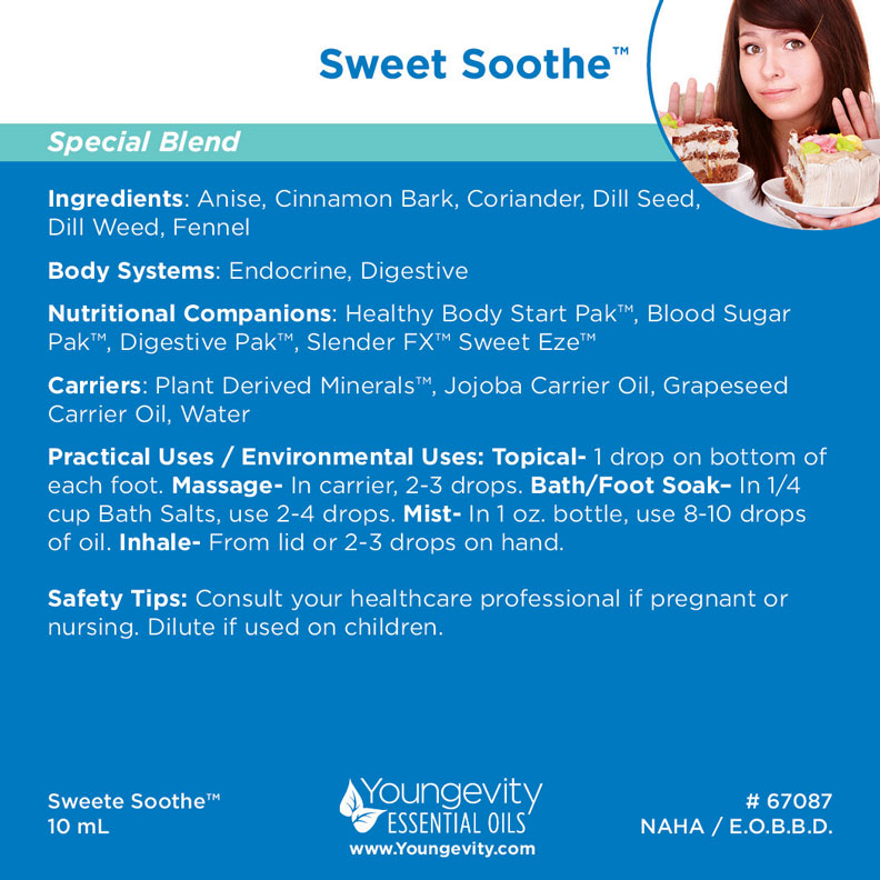Sweet Soothe™ is a powerful blend made with 100% pure, therapeutic Youngevity Essential Oils. This blend contains: Anise, Cinnamon Bark, Coriander, Dill Seed, Dill Weed and Fennel.