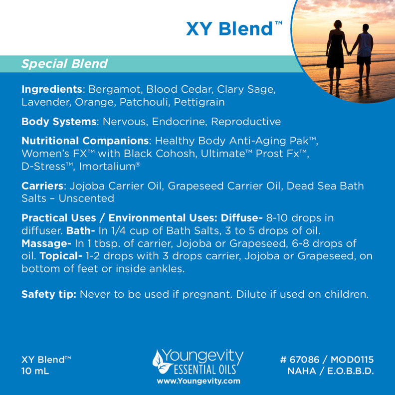 XY Blend™ is a powerful blend made with 100% pure, therapeutic Youngevity Essential Oils. This blend contains: Bergamot, Cedarwood, Clary Sage, Lavender, Orange Sweet, Patchouli and Petitgrain.